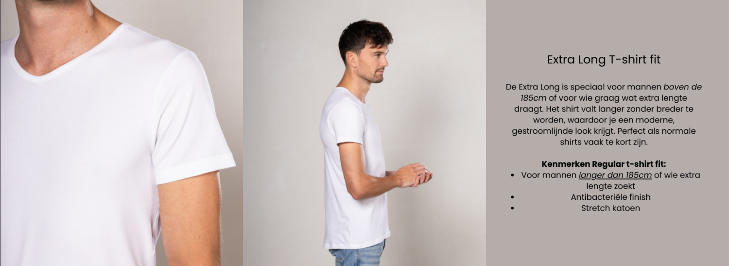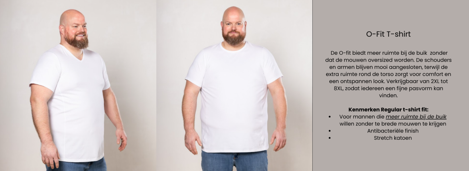 Een T-shirt lijkt misschien een basic item, maar de fit bepaalt hoe jouw outfit eruitziet en aanvoelt, van de manier waarop het je schouders volgt tot hoe het je lengte benadrukt. Daarom is het fijn om te weten welke fit bij jouw lichaam past. In deze blog nemen we je mee in de vier fits: O, V, Regular en Extra Long. We leggen je uit hoe elk shirt valt, wat de kenmerken zijn en voor wie het geschikt is. Zo krijg je een duidelijk beeld van de verschillen en wordt kiezen een stuk makkelijker. Welk lichaamstype jij ook hebt, wij hebben een passende fit!